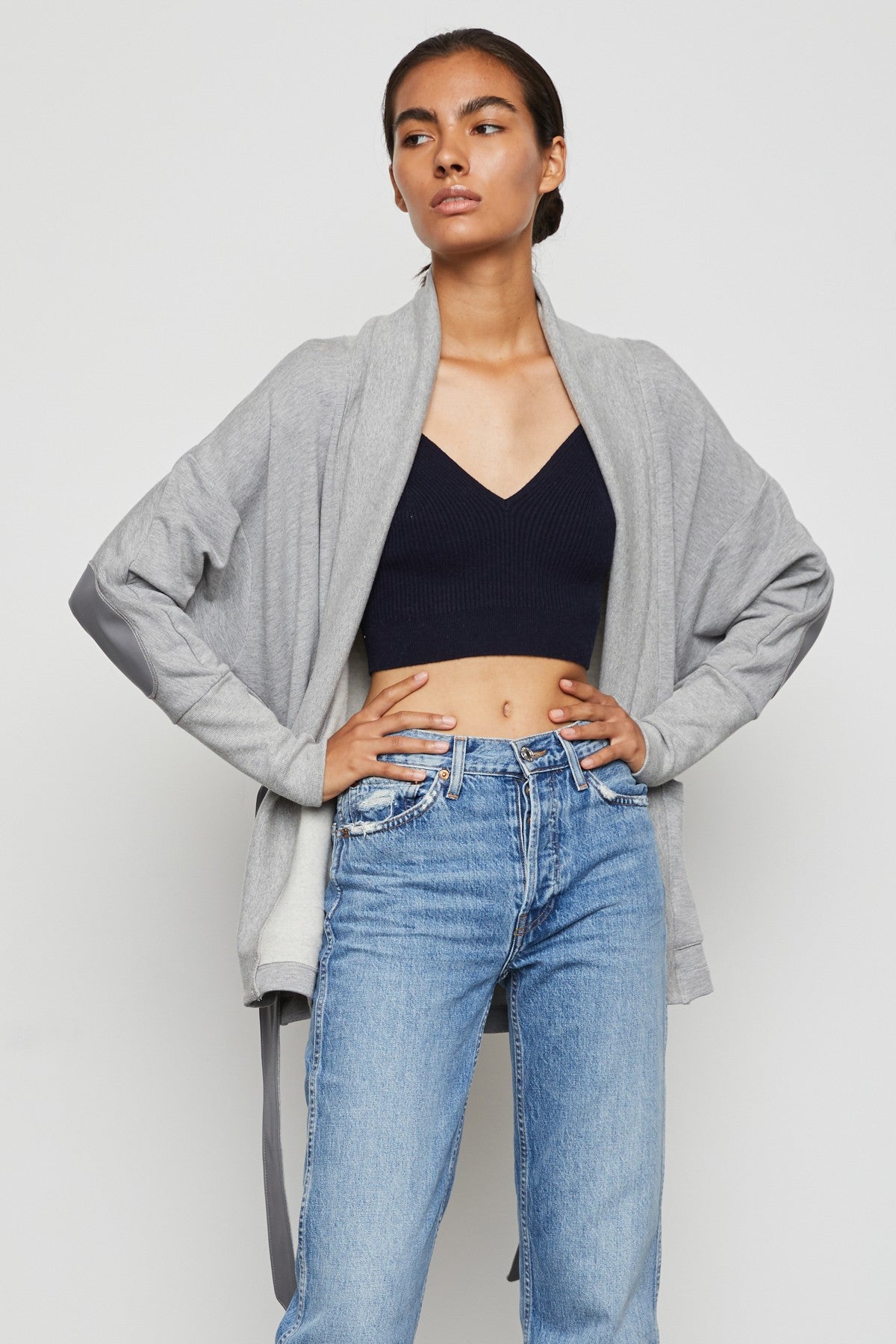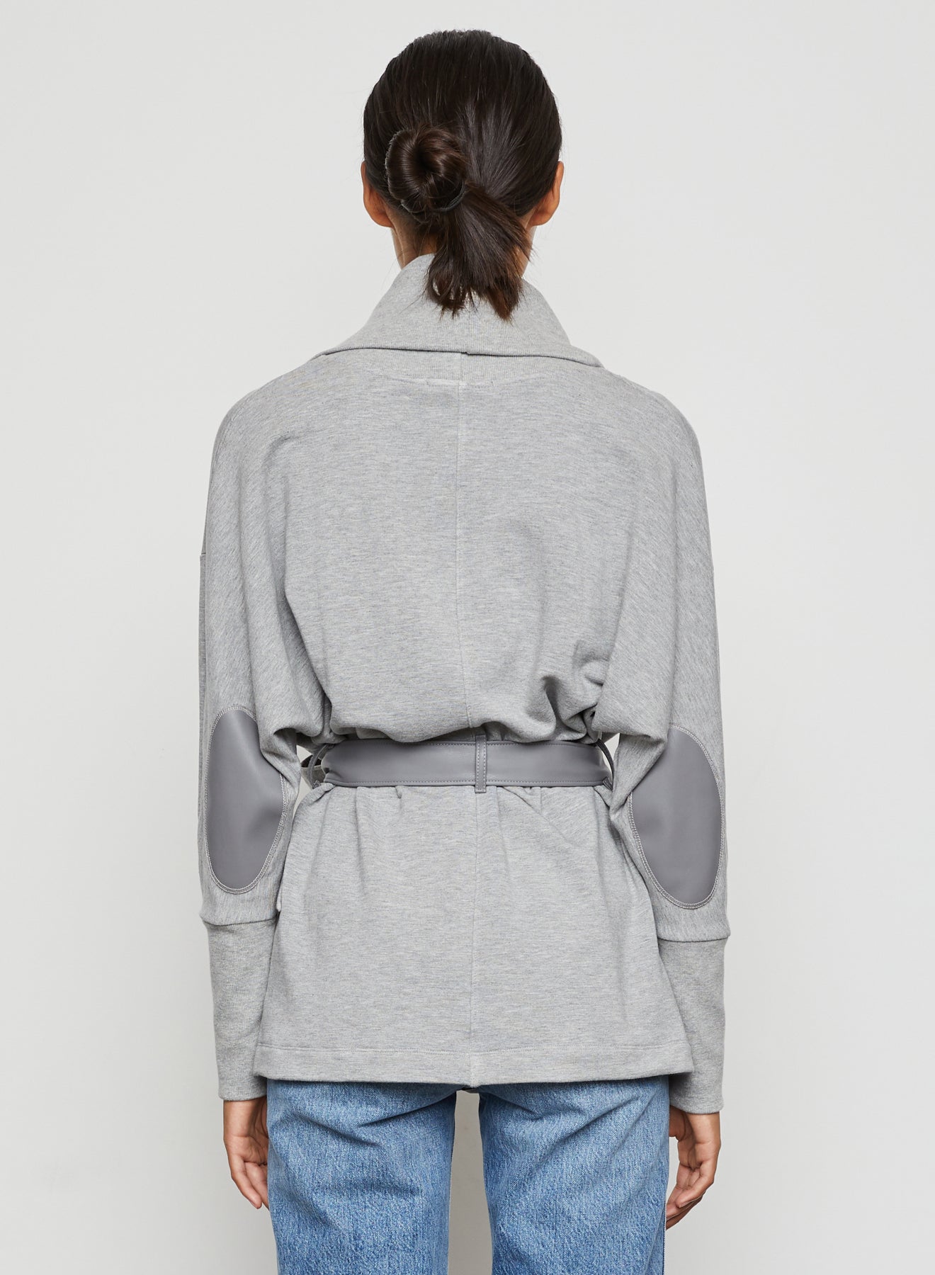 Softly structured, this shawl collar fleece jacket delivers an effortlessly elegant vibe. With contrast alternative leather belt and elbow patches, this year-round essential is just the item to reach for on cool days. We layered the jacket with our Midnight Blue Octavia Sweater Bralette.