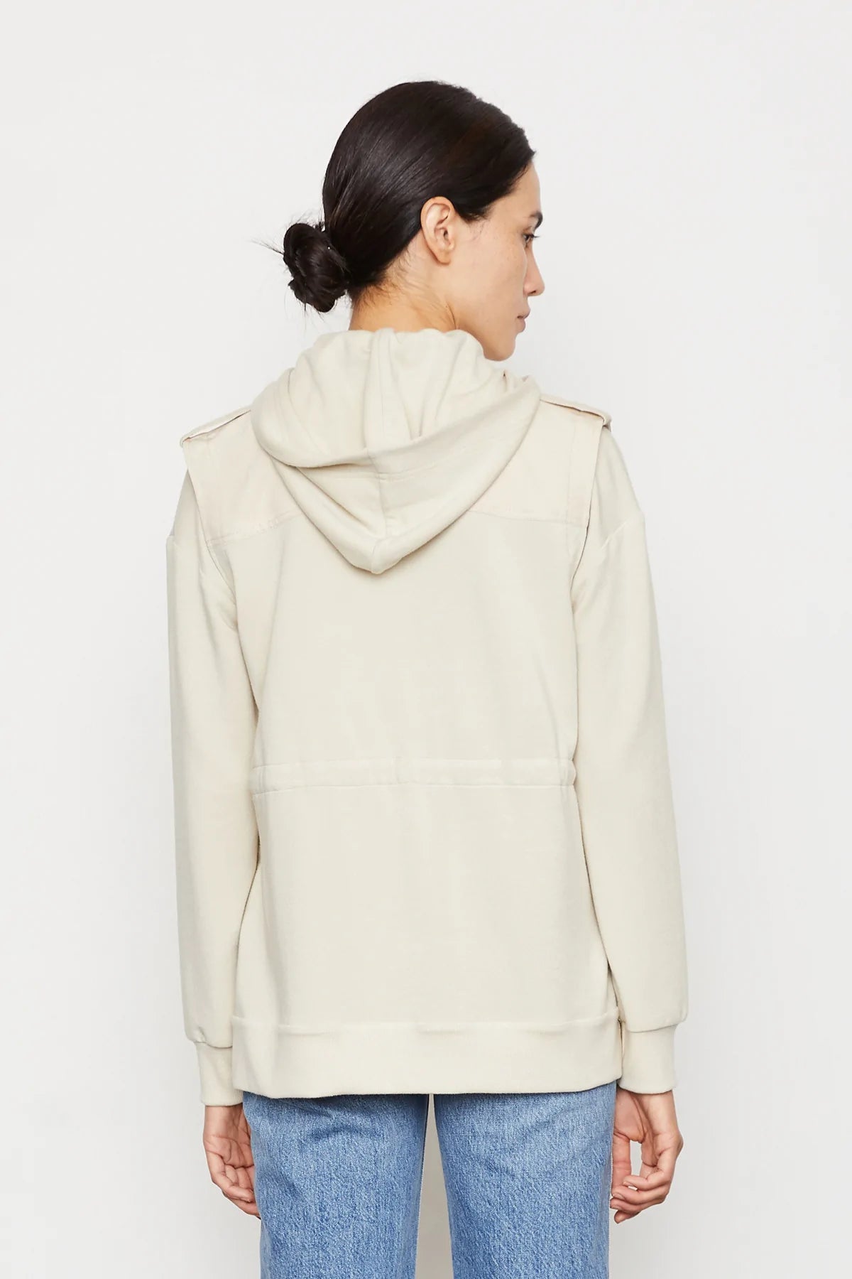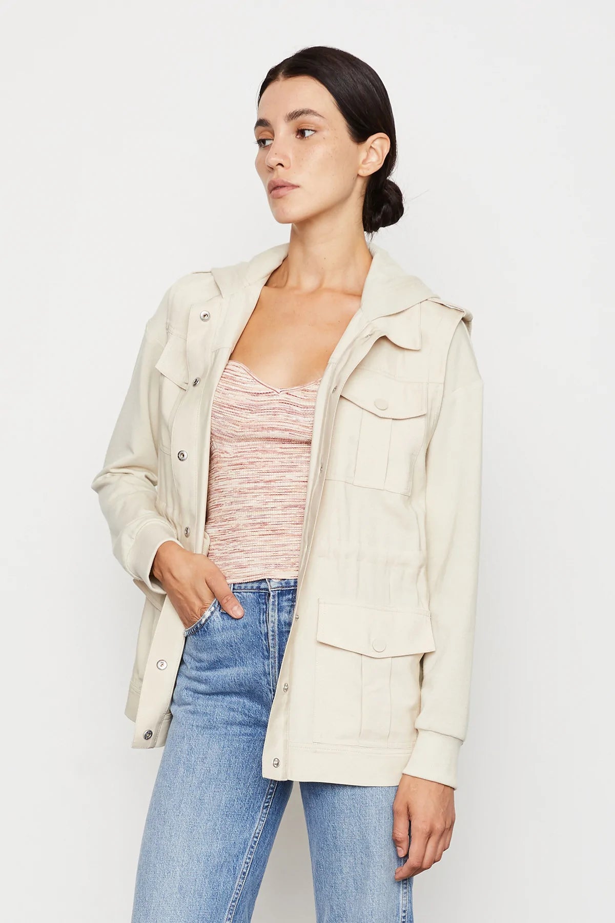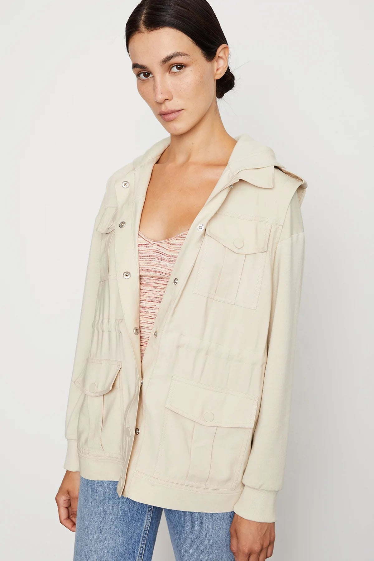 Our versatile hooded utility jacket with a chic woven front and fleece back. Complete with cargo-style pockets, snap-front closure, drawstring waist, and epaulet detail on shoulder.