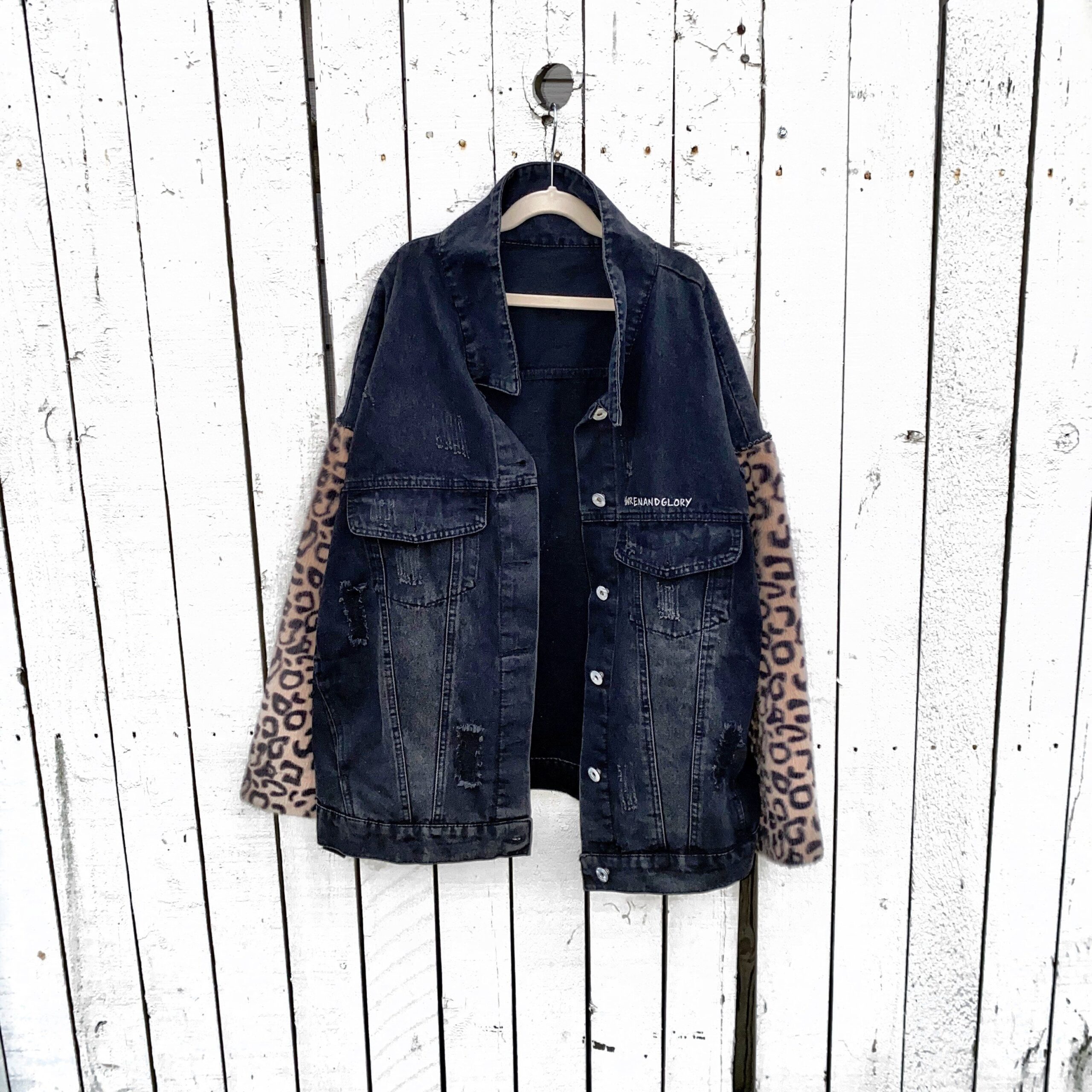 - Blackdenim jacket with super comfortableleopard pattern sleeves.