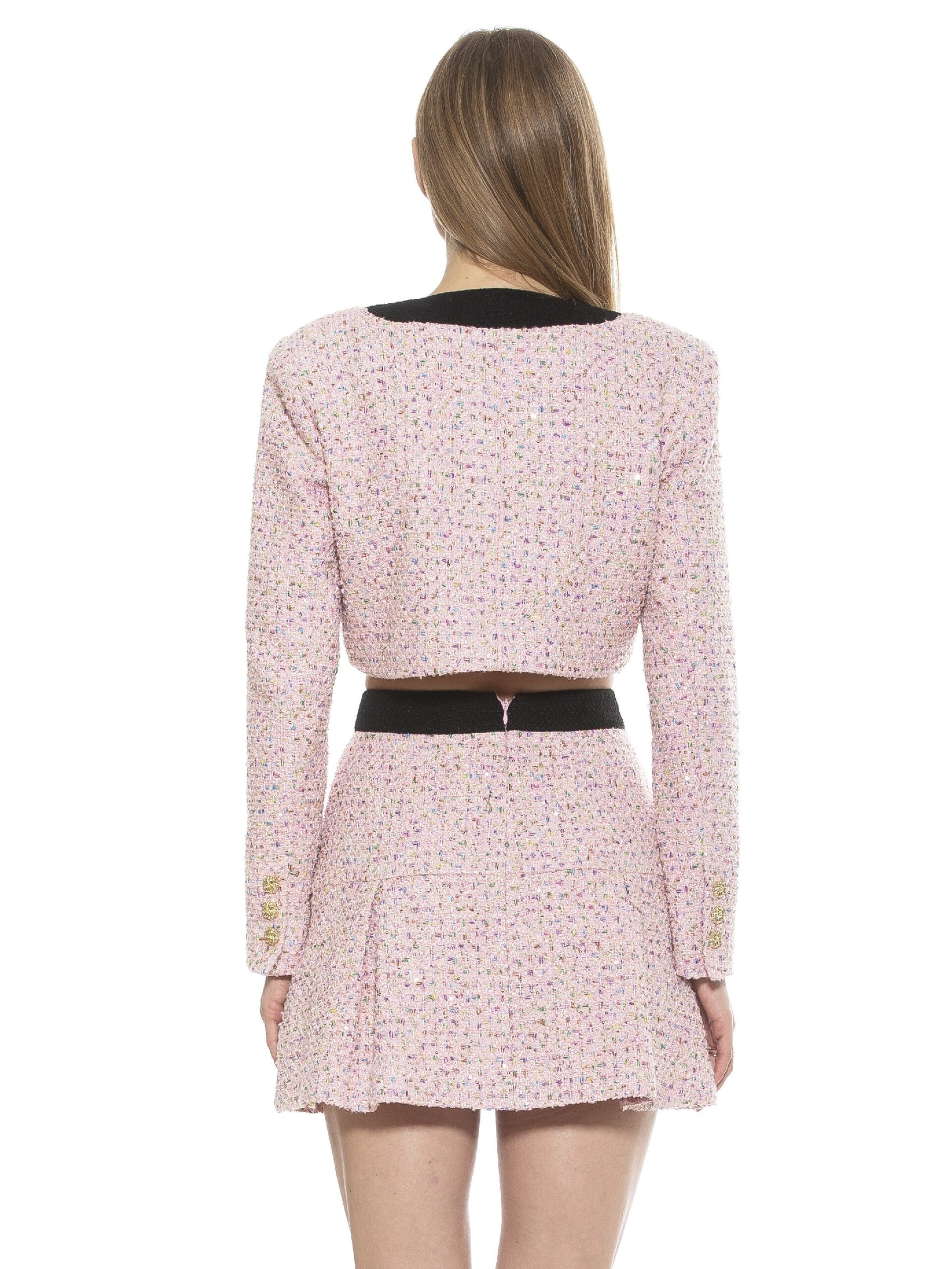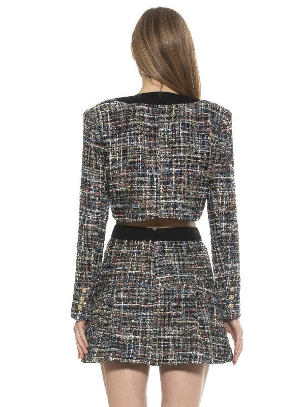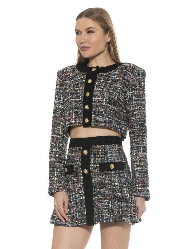 Be your own boss. The Clara is a cropped mini jacket. The jacket has contrasting trim with gold button details.