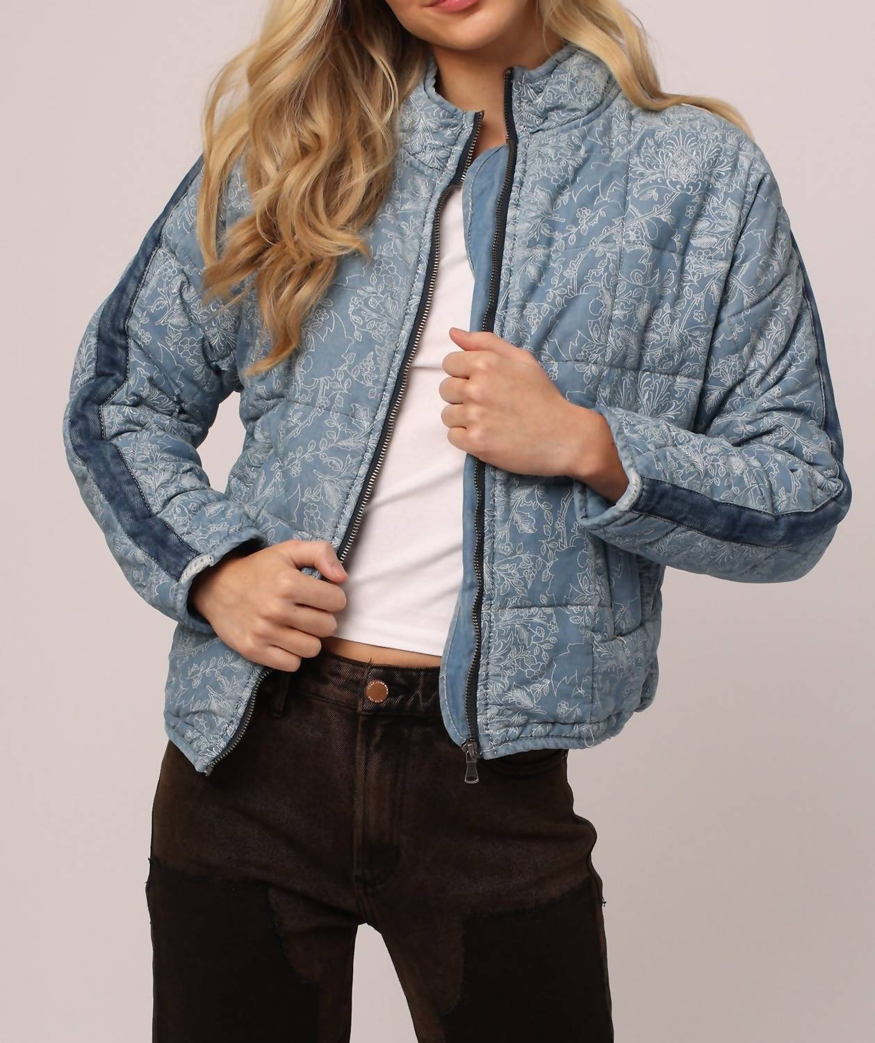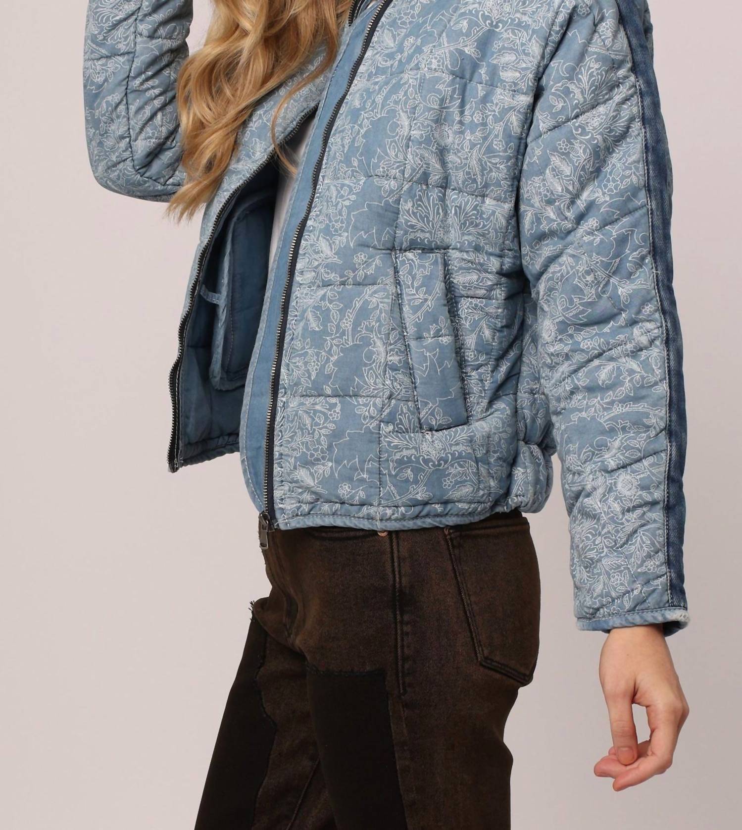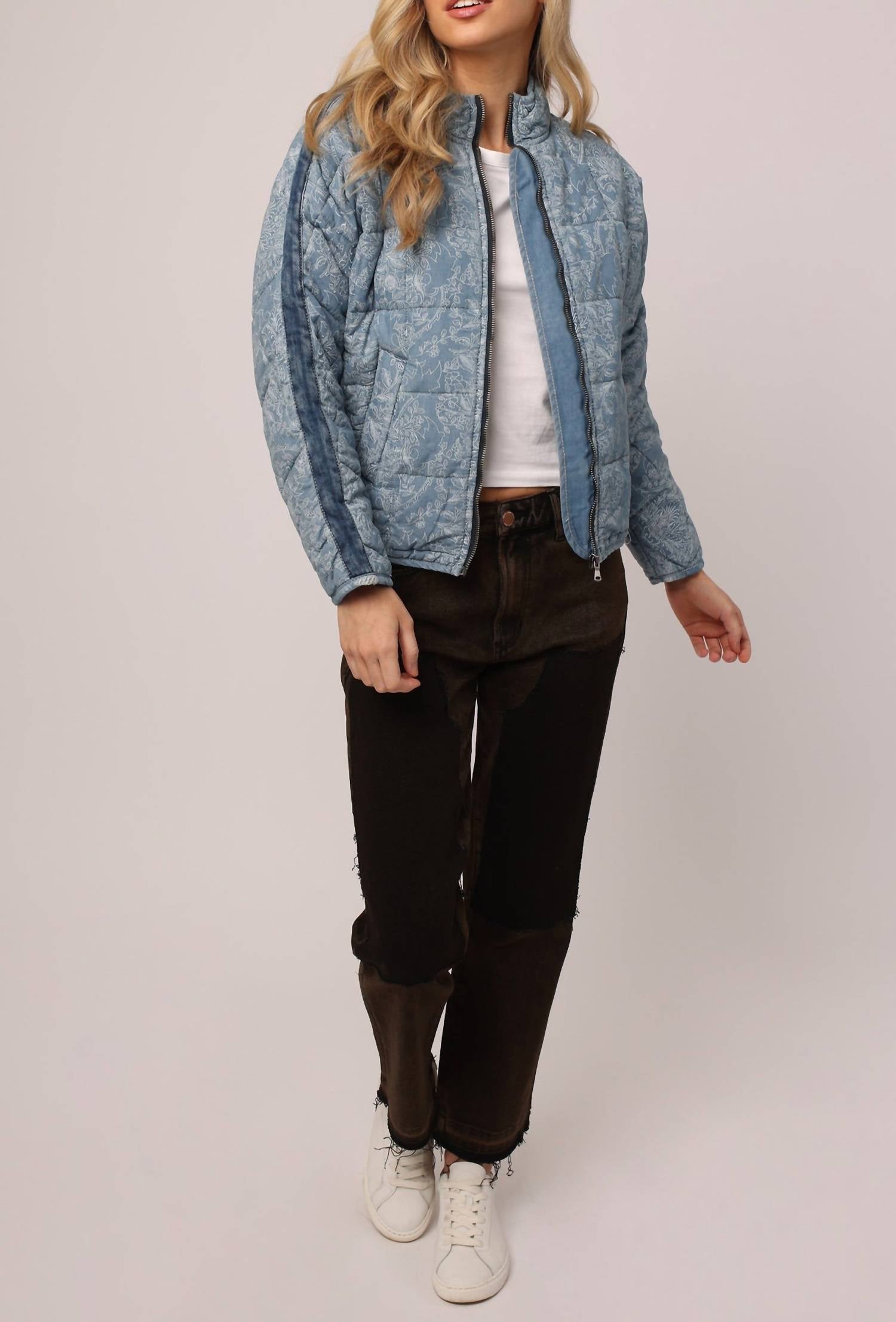 A riff on your favorite classic bomber jacket.Quilt stitching accented, long sleeve lined jacket finished with mock collar with pipings, contrast denim shoulder taping, front welt pockets, elastic hem band for support. Multi print woven on relaxed fit, styled with navy front zipper. Body length from HPS – 23′, Sleeve length – 27 1/2′, Bust – 44′ (Size Small). Machine wash cold.