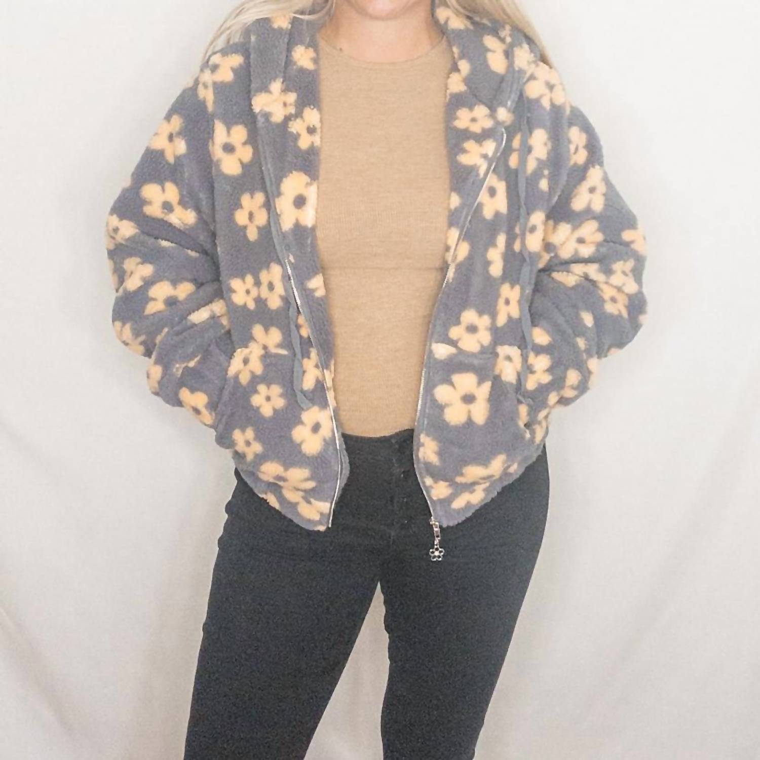Bundle up in this adorable teddy jacket that’ll have you wishing for colder temps.
