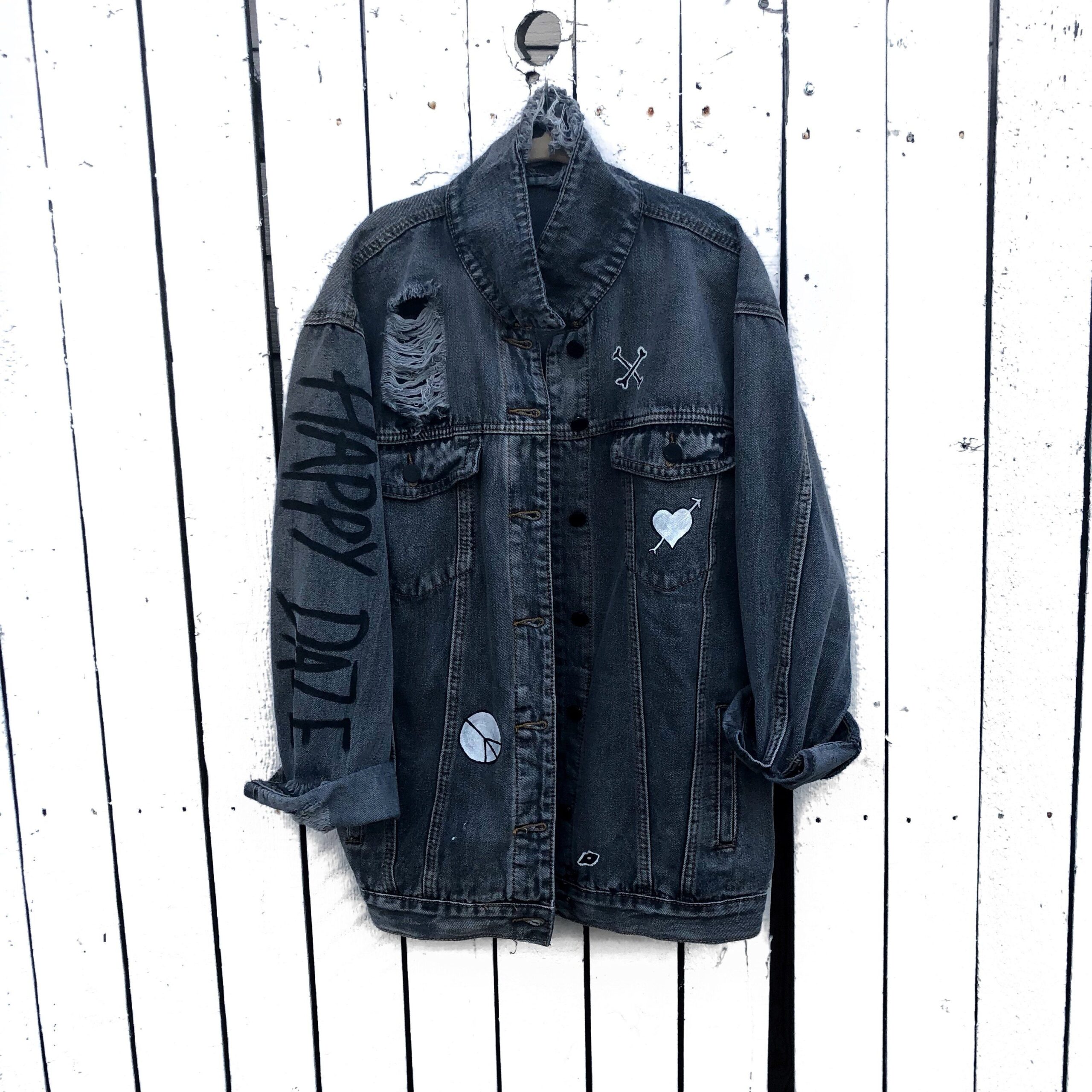 - Yellow smiley on faded black denim jacket, with hand painted symbols throughout.