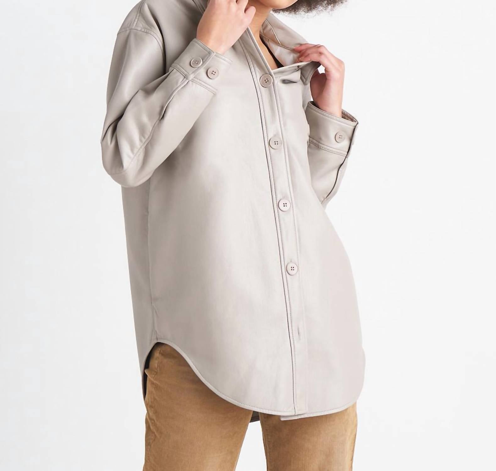A leather jacket so good, it works with just about any outfit.Magnificent overshirt in vegan leather, shirt collar, buttoned, loose fit. 55% Polyurethane, 40% polyester, and 5% spandex.