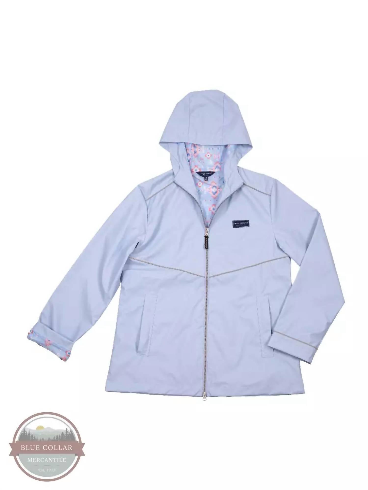 Water resistant, hooded, full zip rain jacket featuring a polyurethane outer shell, front pockets, reflective trim, a patterned inner lining, and a woven Simply Southern patch on the left chest. Shell – 100% Polyurethane. Backing – 100% Polyester. Body Lining – 100% Polyester