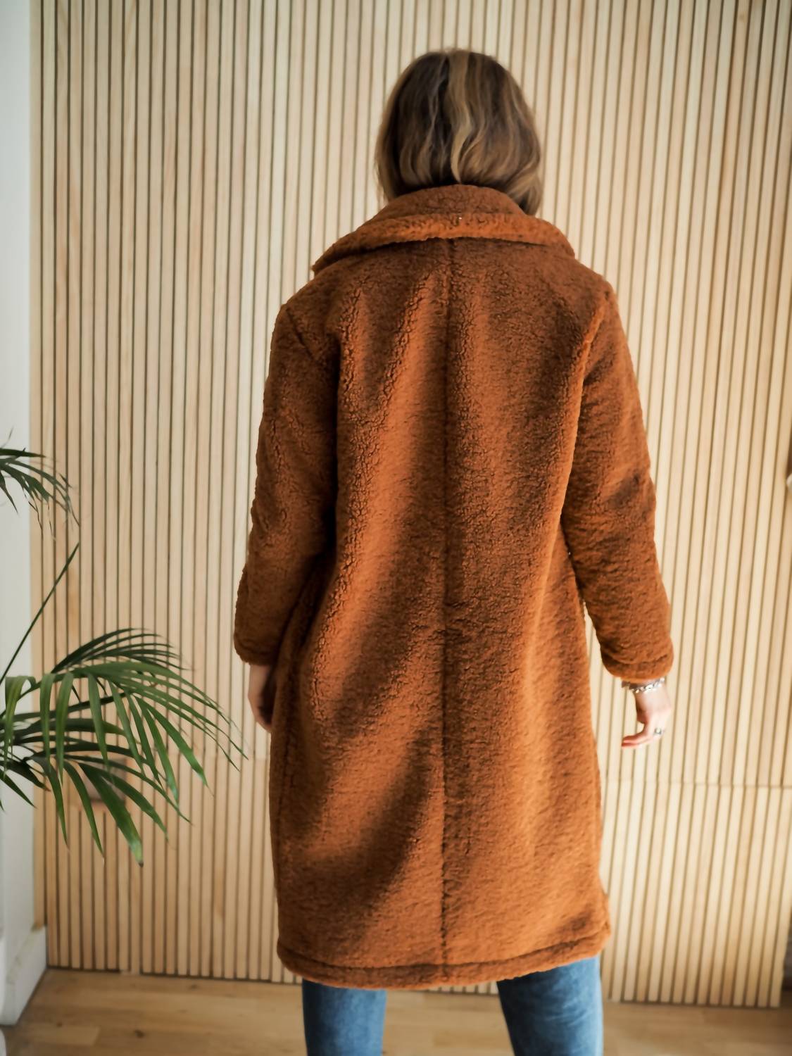 Bundle up in this adorable teddy jacket that’ll have you wishing for colder temps.Snuggle up in the full sherpa construction of the SAIDE jacket,designed to hit below the knee for extra warmth and comfort.Content and CareHand wash coldseparatelyLay flat to dryDo not dry cleanLength – 41’Bust – 44′(Measured with a size small)