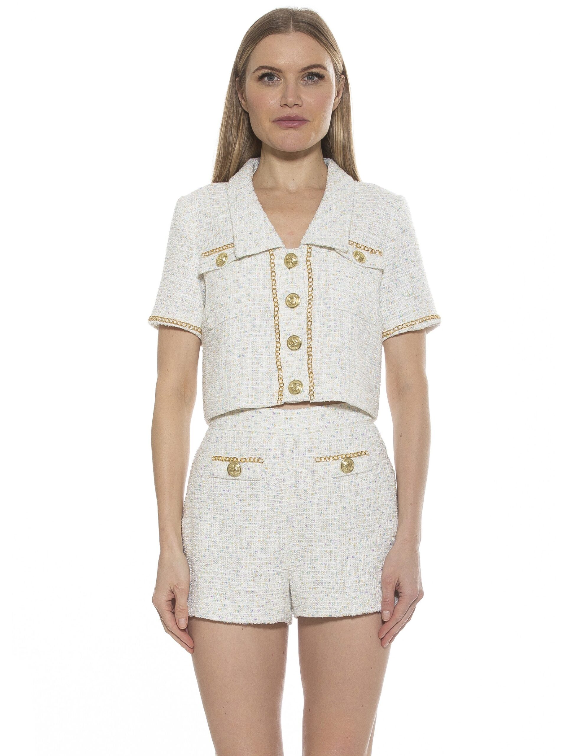 We have a set for you. The Selena is a tweed short sleeve collared jacket. The jacket has a gold chain trim and gold button details.