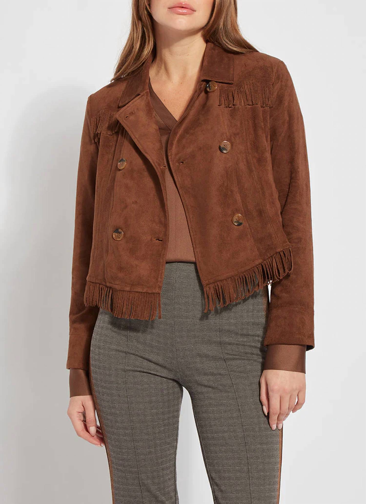 Cute, casual, and comfortable. This jacket is a must have.Double-breasted jacket with end-cut fringe detailing, the Zora Fringe Suede Jacket offers a slim, cropped shape, side welt pocket, wrist slits and faux horn buttons. Unlined with satin piping inside. Vegan suede. Model is 5’10”, wearing size S.